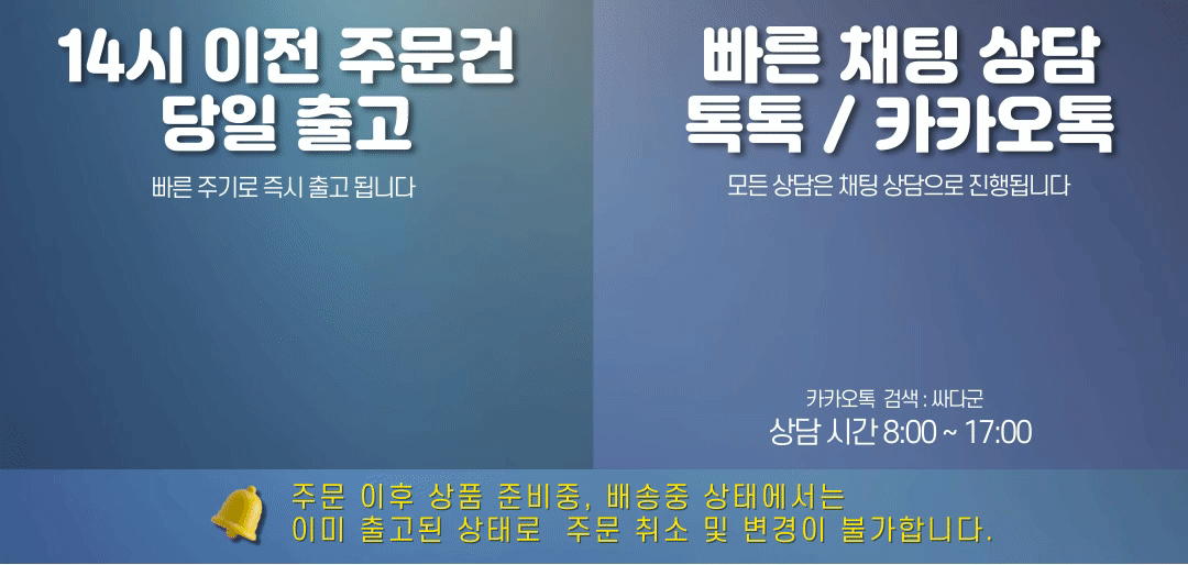 14시 이전 주문건은 당일 발송을 원칙으로 합니다. 빠른 배송을 위해 짧은 주기로 즉시 출고가 이뤄지고 있습니다. 상품준비중, 배송준비중, 배송중 후에는 취소나 추가주문, 주문변경, 주문취소 주소변경이 되지 않으니 이점 유의하시기 바랍니다.