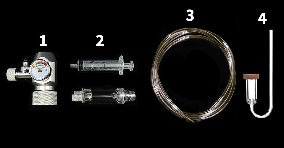 1. 소다스트림 전용 레귤레이터 / 2. 버블카운터 싱글헤드 / 3. 고압호스 1m / 4. 이탄확산기 / 5. 장갑