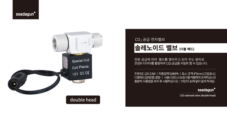 호스 중간에 연결하여 전원 공급에 따라 밸브를 열어주고 닫아주는 제품입니다. 콘센트타이머를 사용하여 co2 공급을 자동화 할 수 있습니다.
