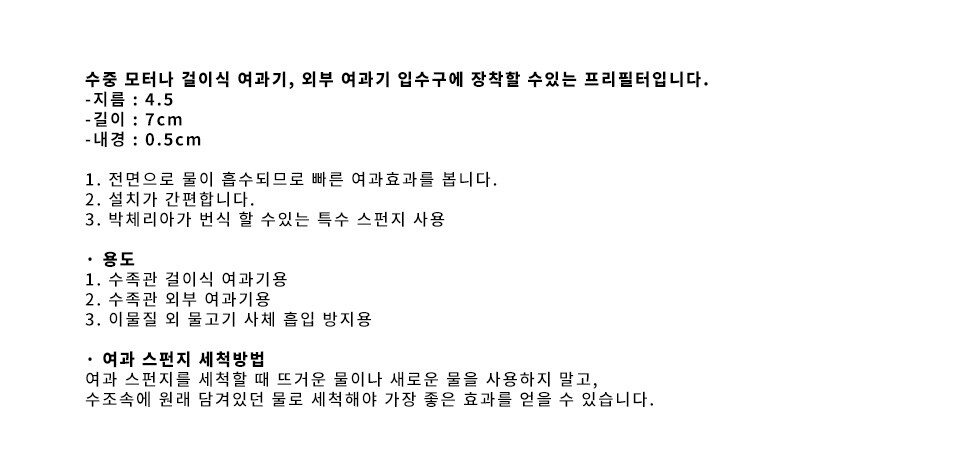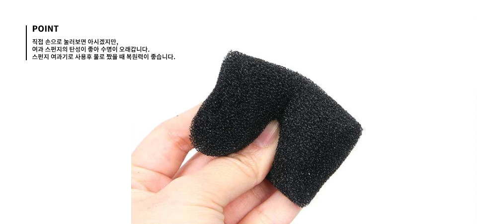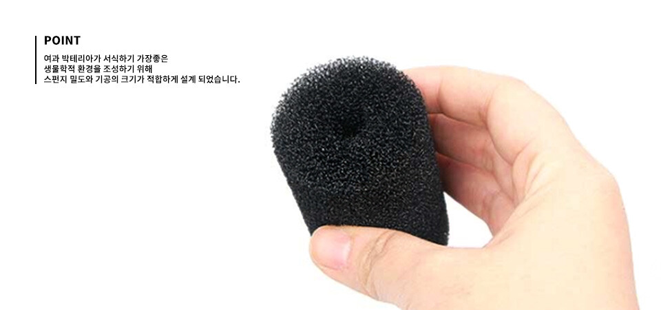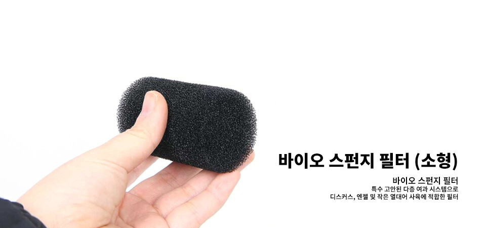 여과기가 물을 끌어올리는 부분에 껴주는 스펀지 필터입니다! 소형어종, 새우 등을 키우는 사육자들을 위한 기본템!