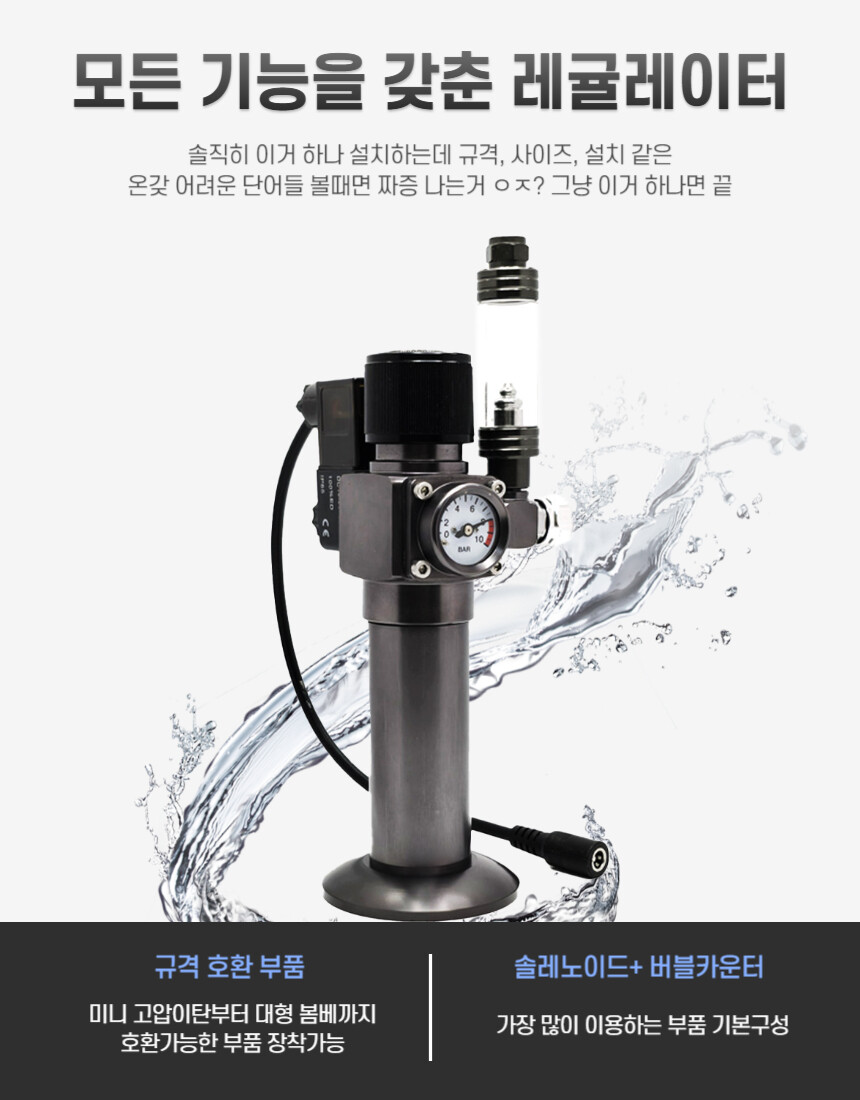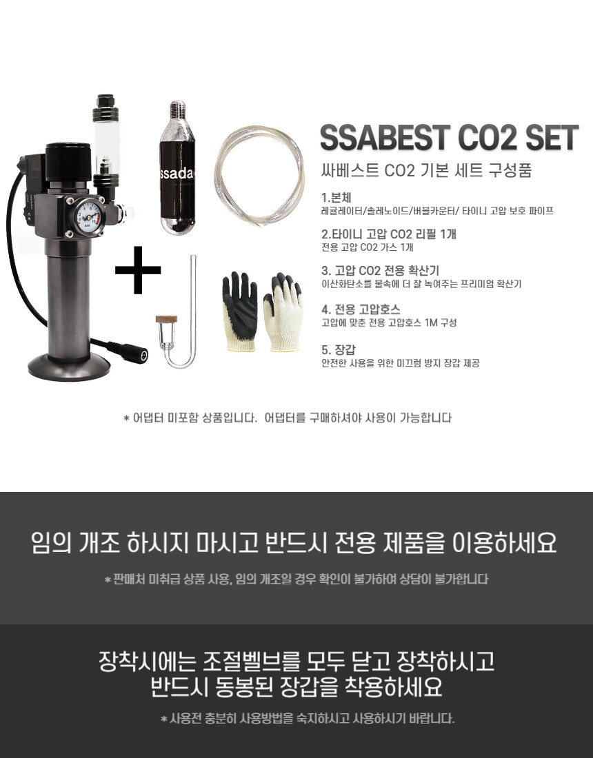 1. 본체(버블카운터, 솔레노이드 기본구성) / 2. co2 카트리지 1개 / 3. 고압 호스 1m / 4. 싸다군 디퓨저 노멀 S / 5. 코팅장갑