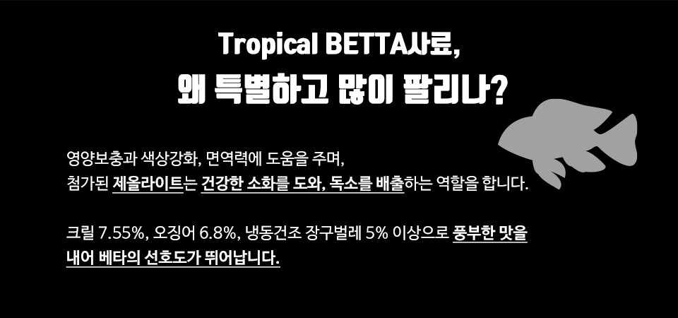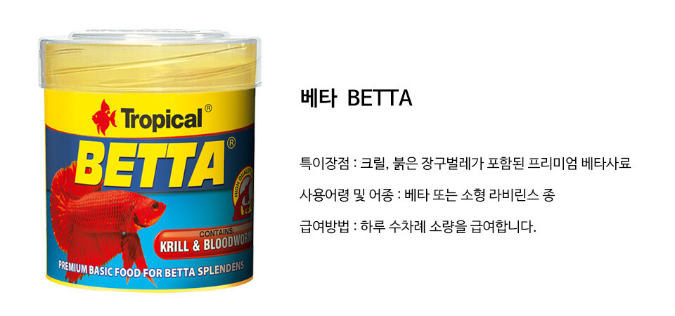 베타 또는 소형어종을 위한 완벽한 먹이로 풍부한 에너지를 공급하며 지느러미의 발달과 색상을 강화시켜 주는 프리미엄 사료입니다.
