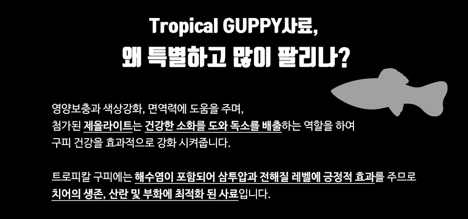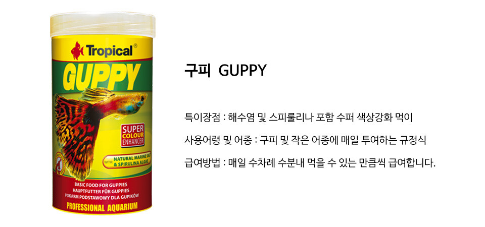 풍부하여 색상발현에 도움이 되는 최적화된 구피사료 입니다.