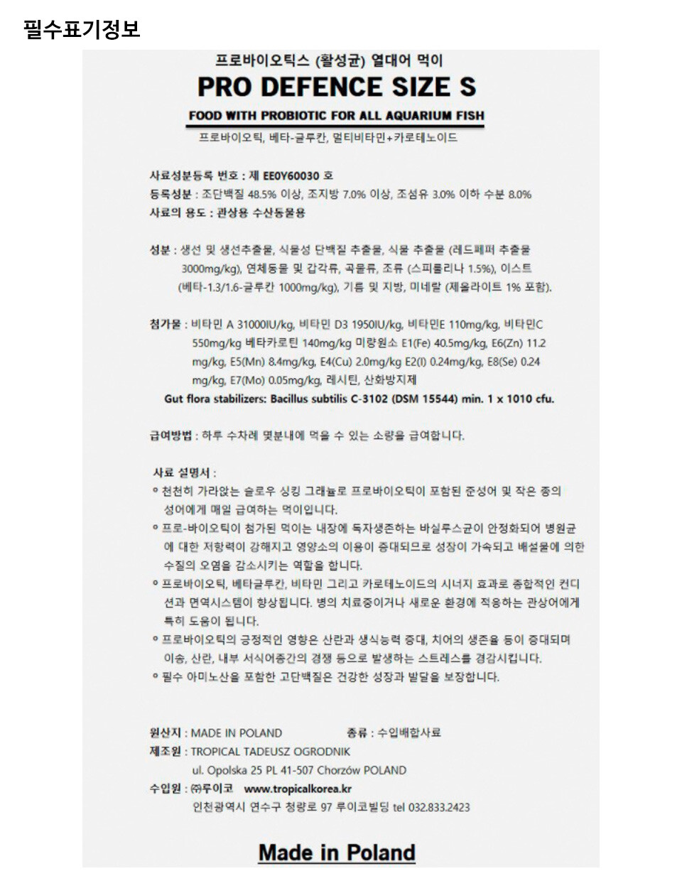 싸다군이 폴란드놈 사료를 판매하는 가장큰 이유인 사료입니다 어종들이 겪는 소화불량으로 인한 폐사와 고단백 사료로 인한 소화 스트레스 개선이 목적인 특수사료입니다. 성장기인 치어때 가장 효과적이고 성어들에게도 주식으로 충분히 사용가능합니다 무조건 하나씩 구입하세용 사료덕후들에게는 기본템입니다 소량씩 수입하여 항시 최신 제조일자 유지하고 있습니다
