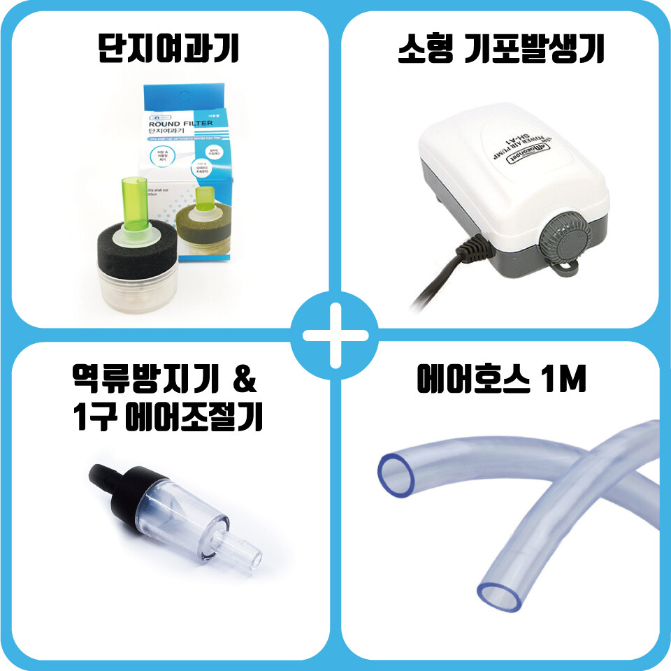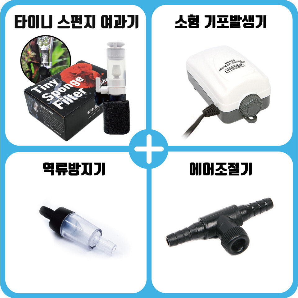 구성품 : 타이니 스펀지 여과기 1개 + 소형 기포발생기 1개 + 역류방지기 1개 + 1구 에어조절기 1개