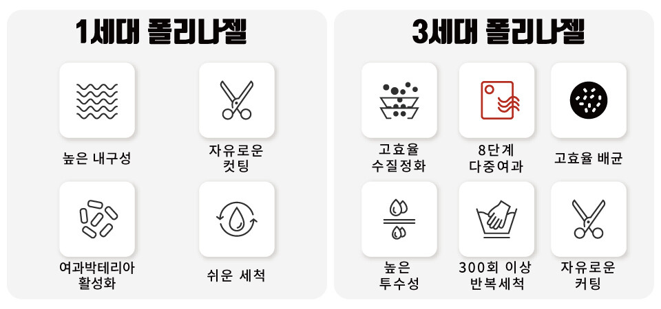 3세대 폴리나젤은 8단계 필터 구성과 밀도로 최적의 필터 효과를 보여줌