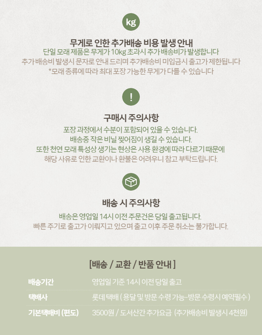 무게가 무거운 상품의 경우와 제품의 파손이 불가피한 경우 추가 배송비가 발생하게 됩니다. 사전에 전화로 안내드리며 선불 또는 착불로 배송처리가 가능합니다. 다만 전화를 안받으시는 경우는 부득이 사전 통화없이 착불 배송이 진행됩니다.